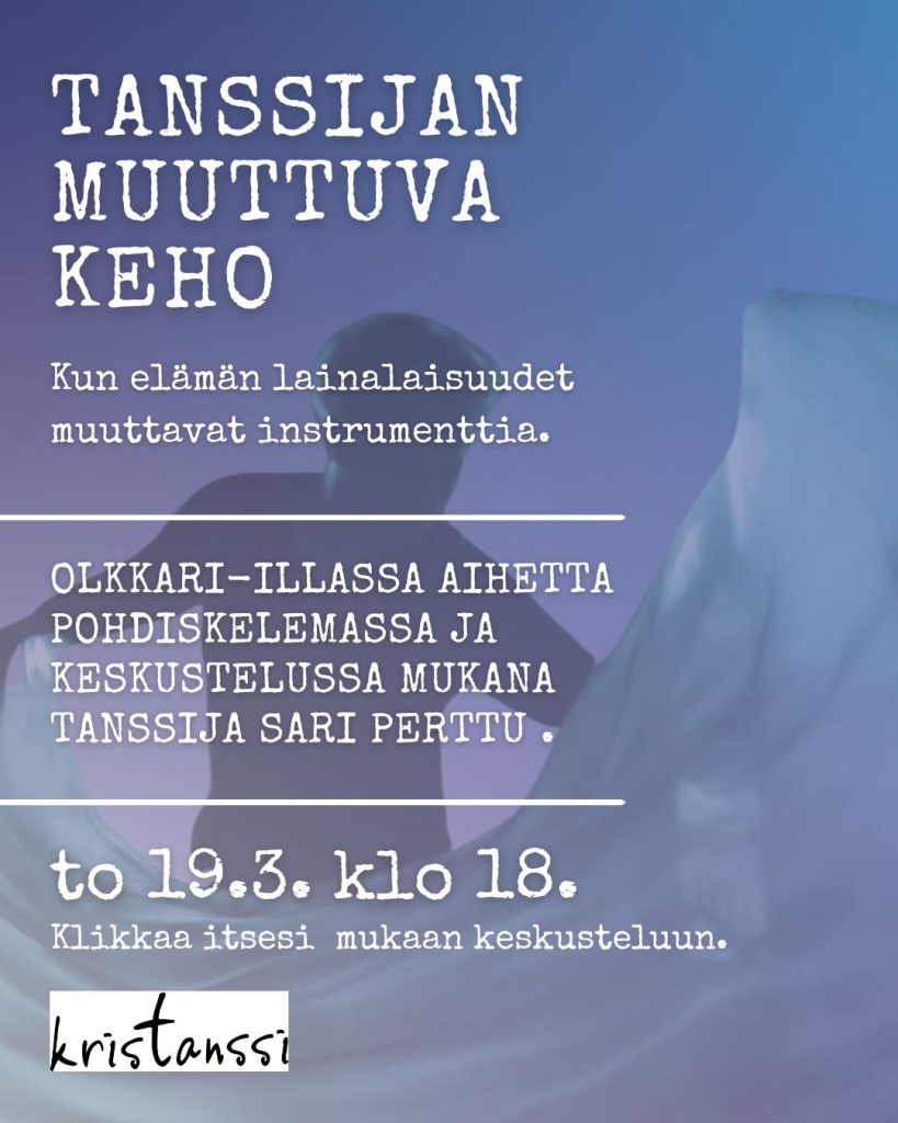 Online Olkkari-ilta 19.3. ”Tanssijan muuttuva keho” Klikkaa alla olevaa linkkiä osallistuakseni Olkkari-iltaan! Lämpimästi tervetuloa! https://calendar.app.google/oGArjAgXaFUGRLcy9